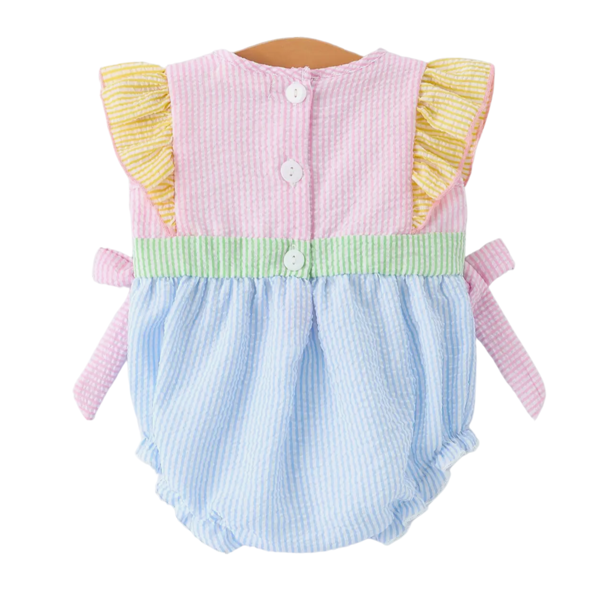 - Short Sleeve Smocked Romper With Multiple Pastel Colors & Embroidered "Jesus Loves Me” Letters
